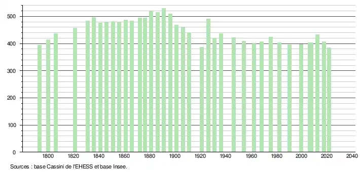 L'évolution du nombre d'habitants est connue à travers les recensements de la population effectués dans la commune depuis 1793. Pour les communes de moins de 10 000 habitants, une enquête de recensement portant sur toute la population est réalisée tous les cinq ans, les populations légales des années intermédiaires étant quant à elles estimées par interpolation ou extrapolation[15]. Pour la commune, le premier recensement exhaustif entrant dans le cadre du nouveau dispositif a été réalisé en 2007[16].