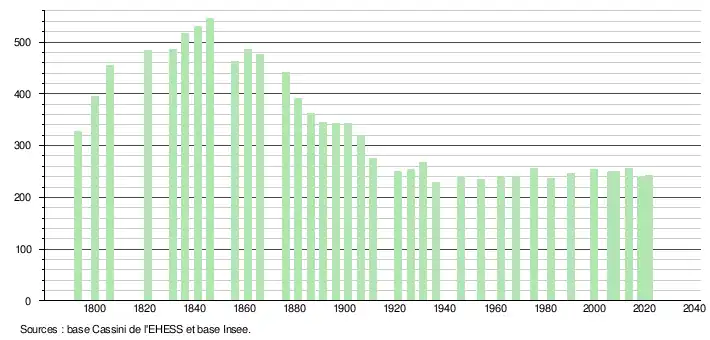 L'évolution du nombre d'habitants est connue à travers les recensements de la population effectués dans la commune depuis 1793. Pour les communes de moins de 10 000 habitants, une enquête de recensement portant sur toute la population est réalisée tous les cinq ans, les populations légales des années intermédiaires étant quant à elles estimées par interpolation ou extrapolation[17]. Pour la commune, le premier recensement exhaustif entrant dans le cadre du nouveau dispositif a été réalisé en 2008[18].