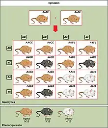 L'épistasie est un phénomène de génétique dans lequel l'effet de la mutation d'un gène dépend de la présence ou de l'absence de mutations dans un ou plusieurs autres gènes, respectivement appelés gènes modificateurs. En d'autres termes, l'effet de la mutation dépend du contexte génétique dans lequel elle apparaît. Les mutations épistatiques ont donc des effets différents lorsqu'elles sont isolées et lorsqu'elles se produisent ensemble. À l'origine, le terme d'épistasie signifiait spécifiquement que l'effet d'une variante d'un gène est masqué par celui d'un autre gène[19]: ["epi + stasis = s'asseoir sur le dessus"]. L'épistasie modifie le rapport caractéristique 9:3:3:1 attendu pour deux gènes non épistatiques.