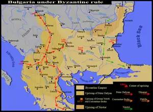 La domination byzantine est un terme utilisé dans l' histoire bulgare pour désigner la domination de l'Empire byzantin qui dura plus de deux siècles sur les terres bulgares . Il ne faut pas oublier qu'avant 681, ces terres faisaient partie de Byzance.