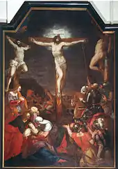 - Le Calvaire. Chargé d'une fonction qui absorbait la majeure partie de son temps, Lampsonius ne produisit que peu de tableaux. Il exécuta, en 1575, une grande toile représentant le Calvaire, destinée au maître-autel de l'église de Saint-Quentin, de Hasselt. Cette composition, la seule production picturale connue de l'artiste, a 3 mètres 75 de hauteur, sur 2 mètres 68 de largeur. Elle est d'un dessin correct et d'une incontestable harmonie de couleur ; mais le modelé manque de force, de relief. Ce tableau décora le maître-autel de l'église de Hasselt jusqu'en 1804, époque à laquelle il fut déplacé et mis contre l'une des parois du transept. Cette toile a souffert assez notablement, surtout dans les ombres, qui sont peintes très légèrement.
