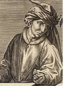 - Portrait de Lambert Lombart. On pense aussi pouvoir lui attribuer un portrait de Lombard, dessin fait à la plume: c'est l'original du portrait gravé dans l'ouvrage publié par Lampson en 1572, sous le titre : Elogia et effigies pictorum celebrium Germaniae Inferioris[20]. Ce dessin, conservé à l'Académie de Dusseldorf, après avoir fait partie de la collection de Krahe, était, à la vérité, attribué, dans l'inventaire de cette dernière, à Giorgio Ghisi, nous ne savons sur quelle autorité. Dans ce dessin, la tète de Lombard a le même type énergique et intelligent qu'offre le portrait gravé par [21], et qui figure en tête de l'opuscule publié par Lampson[22] sous le titre de : Lamberti Lombardi apud Eburones pictoris celeberrimi vita[23].