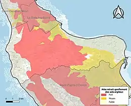 Le retrait-gonflement des sols argileux est susceptible d'engendrer des dommages importants aux bâtiments en cas d’alternance de périodes de sécheresse et de pluie. 66,9 % de la superficie communale est en aléa moyen ou fort (54,2 % au niveau départemental et 48,5 % au niveau national). Sur les 6 739 bâtiments dénombrés sur la commune en 2019, 4 063 sont en aléa moyen ou fort, soit 60 %, à comparer aux 57 % au niveau départemental et 54 % au niveau national. Une cartographie de l'exposition du territoire national au retrait gonflement des sols argileux est disponible sur le site du BRGM[26],[Carte 2].
