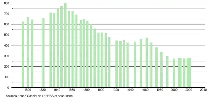 L'évolution du nombre d'habitants est connue à travers les recensements de la population effectués dans la commune depuis 1793. Pour les communes de moins de 10 000 habitants, une enquête de recensement portant sur toute la population est réalisée tous les cinq ans, les populations légales des années intermédiaires étant quant à elles estimées par interpolation ou extrapolation[14]. Pour la commune, le premier recensement exhaustif entrant dans le cadre du nouveau dispositif a été réalisé en 2008[15].