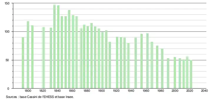 L'évolution du nombre d'habitants est connue à travers les recensements de la population effectués dans la commune depuis 1793. Pour les communes de moins de 10 000 habitants, une enquête de recensement portant sur toute la population est réalisée tous les cinq ans, les populations légales des années intermédiaires étant quant à elles estimées par interpolation ou extrapolation[19]. Pour la commune, le premier recensement exhaustif entrant dans le cadre du nouveau dispositif a été réalisé en 2006[20].