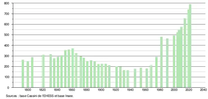 L'évolution du nombre d'habitants est connue à travers les recensements de la population effectués dans la commune depuis 1793. Pour les communes de moins de 10 000 habitants, une enquête de recensement portant sur toute la population est réalisée tous les cinq ans, les populations légales des années intermédiaires étant quant à elles estimées par interpolation ou extrapolation[21]. Pour la commune, le premier recensement exhaustif entrant dans le cadre du nouveau dispositif a été réalisé en 2004[22].