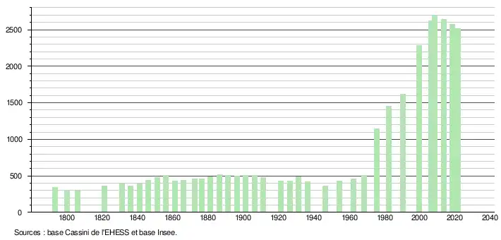L'évolution du nombre d'habitants est connue à travers les recensements de la population effectués dans la commune depuis 1793. Pour les communes de moins de 10 000 habitants, une enquête de recensement portant sur toute la population est réalisée tous les cinq ans, les populations légales des années intermédiaires étant quant à elles estimées par interpolation ou extrapolation[33]. Pour la commune, le premier recensement exhaustif entrant dans le cadre du nouveau dispositif a été réalisé en 2008[34].