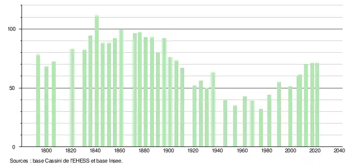 L'évolution du nombre d'habitants est connue à travers les recensements de la population effectués dans la commune depuis 1793. Pour les communes de moins de 10 000 habitants, une enquête de recensement portant sur toute la population est réalisée tous les cinq ans, les populations légales des années intermédiaires étant quant à elles estimées par interpolation ou extrapolation[16]. Pour la commune, le premier recensement exhaustif entrant dans le cadre du nouveau dispositif a été réalisé en 2007[17].