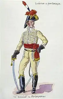 Après la mort de Leclerc atteint par la fièvre jaune, il prend le commandement de l'armée et « met en place une politique de terreur, qui est aussi une politique du massacre organisé »[4]. Pour réprimer la révolte, Rochambeau et son prédécesseur Leclerc avaient fait venir de Cuba des chiens (conduits par le vicomte de Noailles)[5]. Ces chiens chasseurs d'esclaves, parfois appelés dogues de Cuba, utilisés dans les colonies ibériques pour retrouver les esclaves en fuite, avaient été brièvement utilisés par les Anglais lors de la révolte des esclaves de la Jamaïque (1795-1796), ce qui avait suscité une vague de réprobation. Les 300 ou 400 chiens que Rochambeau fit venir à Saint-Domingue ne lui furent d'aucun secours car ils attaquèrent indifféremment tous les blessés, Français aussi bien que rebelles et il fallut s'en débarrasser[6],[7]. Le commandement de Rochambeau est également marqué par la corruption et l'incompétence. Le 18 novembre 1803, il perd la bataille de Vertières devant le général rebelle Jean-Jacques Dessalines[8].