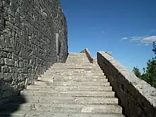 Deux monuments intéressants donnent accès au jardin public par les terrasses, l'escalier à vis d'une ancienne tourelle de défense, qui est un vestige du château fort détruit en 1622, et l'escalier du XVIIe siècle. Ce dernier est l'escalier César Phébus d'Albret, qui a été conçu en 1665 avec ses 124 marches comme une véritable promenade. Il comporte cinq volées rythmées par six paliers et relie les jardins supérieurs, ceux réalisés au pied des remparts et la Seugne. Il permet notamment de voir l'ancienne muraille médiévale du XIIe siècle et la terrasse bâtie en 1630 à flanc de falaise et reposant sur d'élégantes arcades. Ce grand escalier serait de Pierre Dugua de Mons après ses explorations en Nouvelle-France (Canada)[2].