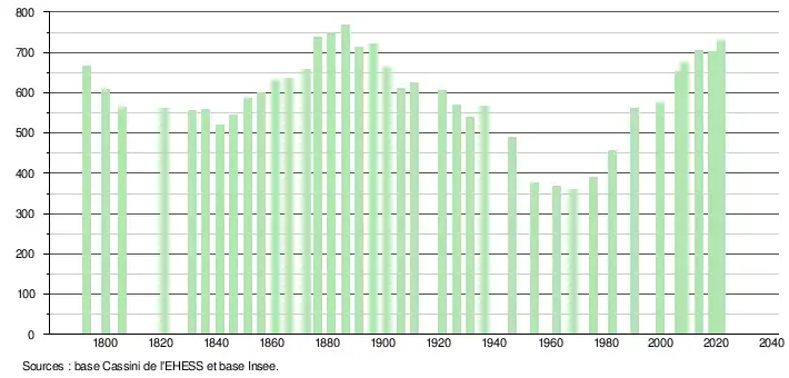 L'évolution du nombre d'habitants est connue à travers les recensements de la population effectués dans la commune depuis 1793. Pour les communes de moins de 10 000 habitants, une enquête de recensement portant sur toute la population est réalisée tous les cinq ans, les populations légales des années intermédiaires étant quant à elles estimées par interpolation ou extrapolation[17]. Pour la commune, le premier recensement exhaustif entrant dans le cadre du nouveau dispositif a été réalisé en 2008[18].