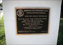 Au cours du temps, le mémorial est oublié et tombe en friche. C'est un guide touristique, l'historien Kevin C. Fitzpatrick (en), qui le découvre en 2006 et, constatant son état de délabrement, il fonde la Dorothy Parker Society[131], vouée à la mémoire de l'œuvre de Dorothy Parker, et qui récolte des fonds pour l'entretien du mémorial. Craignant un déménagement du siège de NAACP, Kevin C. Fitzpatrick contacte la famille de Dorothy Parker qui, avec la collaboration de la NAACP, dépose les cendres de Dorothy Parker au Cimetière de Woodlawn dans le Bronx, en 2020[129],[132],[133],[134],[135],[136].