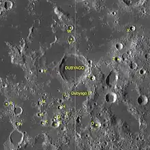 Les cratères dit satellites sont de petits cratères situés à proximité du cratère principal, ils sont nommés du même nom mais accompagnés d'une lettre majuscule complémentaire (même si la formation de ces cratères est indépendante de la formation du cratère principal). Par convention ces caractéristiques sont indiquées sur les cartes lunaires en plaçant la lettre sur le point le plus proche du cratère principal. Liste des cratères satellites de Dubyago :