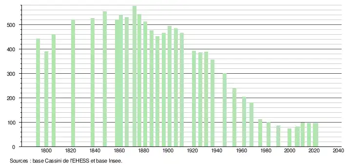 L'évolution du nombre d'habitants est connue à travers les recensements de la population effectués dans la commune depuis 1793. Pour les communes de moins de 10 000 habitants, une enquête de recensement portant sur toute la population est réalisée tous les cinq ans, les populations légales des années intermédiaires étant quant à elles estimées par interpolation ou extrapolation[17]. Pour la commune, le premier recensement exhaustif entrant dans le cadre du nouveau dispositif a été réalisé en 2005[18].