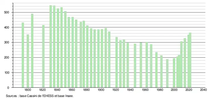 L'évolution du nombre d'habitants est connue à travers les recensements de la population effectués dans la commune depuis 1793. Pour les communes de moins de 10 000 habitants, une enquête de recensement portant sur toute la population est réalisée tous les cinq ans, les populations légales des années intermédiaires étant quant à elles estimées par interpolation ou extrapolation[22]. Pour la commune, le premier recensement exhaustif entrant dans le cadre du nouveau dispositif a été réalisé en 2004[23].