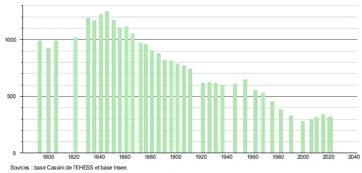 L'évolution du nombre d'habitants est connue à travers les recensements de la population effectués dans la commune depuis 1793. Pour les communes de moins de 10 000 habitants, une enquête de recensement portant sur toute la population est réalisée tous les cinq ans, les populations légales des années intermédiaires étant quant à elles estimées par interpolation ou extrapolation[16]. Pour la commune, le premier recensement exhaustif entrant dans le cadre du nouveau dispositif a été réalisé en 2005[17].