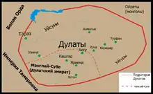 - (ru) Cet article est partiellement ou en totalité issu de l’article de Wikipédia en russe intitulé « Дулаты » (voir la liste des auteurs).