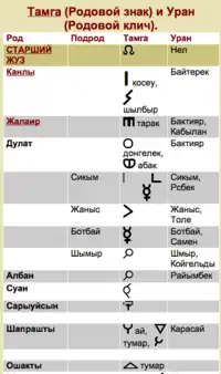 Leur cri de guerre (kazakh : Уран) est «Baktyar». Leur Tamga est «Domalak». L'étymologie du mot «Domalak» évoque le totem du Soleil.