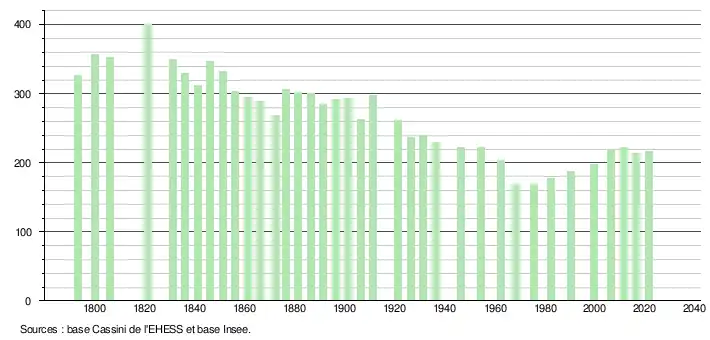 L'évolution du nombre d'habitants est connue à travers les recensements de la population effectués dans la commune depuis 1793. Pour les communes de moins de 10 000 habitants, une enquête de recensement portant sur toute la population est réalisée tous les cinq ans, les populations légales des années intermédiaires étant quant à elles estimées par interpolation ou extrapolation[19]. Pour la commune, le premier recensement exhaustif entrant dans le cadre du nouveau dispositif a été réalisé en 2006[20].