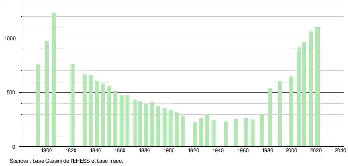 L'évolution du nombre d'habitants est connue à travers les recensements de la population effectués dans la commune depuis 1793. Pour les communes de moins de 10 000 habitants, une enquête de recensement portant sur toute la population est réalisée tous les cinq ans, les populations légales des années intermédiaires étant quant à elles estimées par interpolation ou extrapolation[18]. Pour la commune, le premier recensement exhaustif entrant dans le cadre du nouveau dispositif a été réalisé en 2005[19].