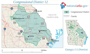 Le 12e district congressionnel de Géorgie est un district de l'État américain de Géorgie. Il est représenté par le Républicain Rick Allen. Les limites du district ont été redessinées à la suite du recensement de 2010, qui a accordé un siège supplémentaire à la Géorgie[1]. La première élection utilisant les nouvelles limites des districts (énumérées ci-dessous) a été les élections de 2012.