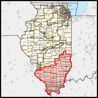 2023–Présent Alexander, Clark, Clay, Clinton, Coles (en partie), Crawford, Cumberland, Edwards, Effingham, Franklin, Gallatin, Hamilton, Hardin, Jackson, Jasper, Jefferson, Johnson, Lawrence, Marion, Massac, Monroe, Perry, Pope, Pulaski, Randolph, Richland, Saline, St. Clair (en partie), Union, Wabash, Washington, Wayne, White et Williamson | |||||