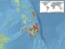 Cette espèce est endémique des Philippines[1]. Elle se rencontre entre 200 et 900 m d'altitude sur Mindanao, sur Dinagat, sur Leyte et sur Samar.