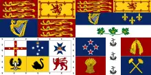 Différentes variantes de chaque blason avaient été présentées en fonction de l'année de fabrication de chaque drapeau. Cela peut-être vu dans les armoiries du Canada qui ont changé après l'adoption d'un nouveau dessin en 1921. On ne sait pas pourquoi les armoiries australiennes initialement utilisées n'ont jamais été mises à jour après avoir été remplacées en 1912[55], mais le dessin de 1908 a reçu un changement, dans des couleurs au cours des années suivantes qui n'ont pas été observées ailleurs. Il semble également qu'il y ait eu une variante du drapeau de l'Empire datant de 1921, unique à l'Australie. Il comportait une couronne de feuilles d'érable et de chêne autour des armoiries du Canada, une étoile de l'Inde beaucoup plus petite et une croix du saint Georges décentrée. De plus, les armoiries canadiennes semblent être un modèle utilisé de 1873 à 1907 en raison de l'absence visible de la Saskatchewan et de l'Alberta. Cette variante du drapeau a été déployé à l'origine lors du dévoilement du mémorial de guerre de Dangarsleigh (en) en 1921[54]. Des reconstitutions modernes d'un drapeau de l'Empire utilisant les armoiries du Canada d'après 1921 et de l'Afrique du Sud d'avant 1930 ont également été réalisées[56].