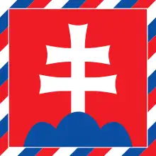 « Au centre d'un champ blanc est arboré l'écu national de la République slovaque ; sous l'écu la devise d'or “VERNÍ SEBE SVORNE NAPRED[note 1]” ; dans chaque coin du champ une rose héraldique entrecroisée d'une flèche d'or. Sur chaque côté, entre les roses héraldiques, sont situées trois double croix au bras semblable de couleur rouge. Le tout est entouré d'un cordon azur en forme de croix et encadré d'une décoration en or [21]. »