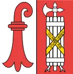 | Éléments | Une crosse épiscopale rouge et des fasces rouge et blanches |