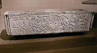 Il a été retrouvé à Soissons dans l'ancienne église Notre-Dame ; cette cuve de sarcophage en pierre ornée de rinceaux de vigne, du VIe siècle qui aurait abrité sa dépouille, selon la tradition locale. Elle a été transportée au Musée du Louvre.
