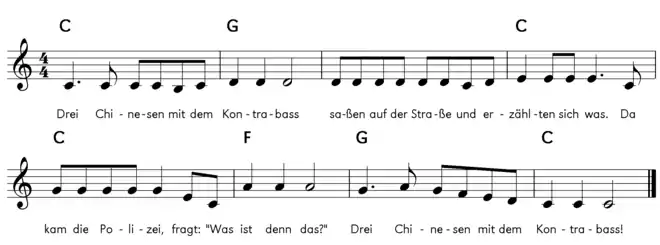 Drei Chinesen mit dem Kontrabass est une chanson enfantine en allemand. Le titre signifie « Trois Chinois avec la contrebasse ». Elle est construite de la même façon que Buvons un coup, ma serpette est perdue, c'est-à-dire qu'une fois le premier couplet chanté, une voyelle donnée (qui change après chaque couplet) remplace toutes les voyelles du couplet. Il existe plusieurs versions de cette chanson avec différentes voyelles utilisées ou chantée sur une mélodie alternative.