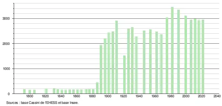 L'évolution du nombre d'habitants est connue à travers les recensements de la population effectués dans la commune depuis 1793. Pour les communes de moins de 10 000 habitants, une enquête de recensement portant sur toute la population est réalisée tous les cinq ans, les populations légales des années intermédiaires étant quant à elles estimées par interpolation ou extrapolation[33]. Pour la commune, le premier recensement exhaustif entrant dans le cadre du nouveau dispositif a été réalisé en 2006[34].