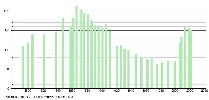 L'évolution du nombre d'habitants est connue à travers les recensements de la population effectués dans la commune depuis 1793. Pour les communes de moins de 10 000 habitants, une enquête de recensement portant sur toute la population est réalisée tous les cinq ans, les populations légales des années intermédiaires étant quant à elles estimées par interpolation ou extrapolation[9]. Pour la commune, le premier recensement exhaustif entrant dans le cadre du nouveau dispositif a été réalisé en 2008[10].