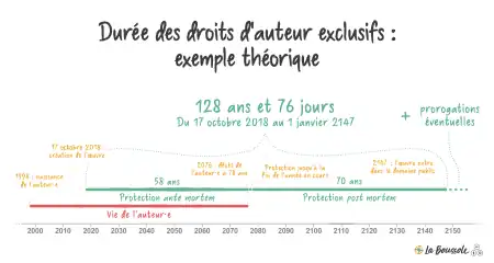 La durée des droits patrimoniaux couvre la vie de l'auteur. À la mort de l'auteur, ces droits persistent au bénéfice de ses ayants droit pendant l'année civile en cours et les soixante-dix années qui suivent[20] (avant la loi du 27 mars 1997, c'était seulement cinquante ans).