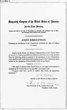 En 1916, Alice Paul fonde le National Woman's Party (NWP), groupe militant qui se consacre au vote d'un amendement sur le droit de vote des femmes. Plus de 200 soutiens du NWP, les Silent Sentinels, sont arrêtés en 1917 à cause de leurs manifestations devant la Maison-Blanche ; certains membres se mettent en grève de la faim, puis emprisonnées et nourries de force. Sous la direction de Carrie Chapman Catt, le NAWSA, fort de 2 millions de membres, établit comme prioritaire l'évolution des lois électorales. Après une série de votes très disputés au Congrès des États-Unis et dans les législatures des États, le dix-neuvième amendement de la Constitution des États-Unis est intégré dans la constitution le [4]. Il proclame que « Le droit de vote aux citoyens des États-Unis ne saurait être refusé ou limité, ni par les États-Unis, ni par ses États, en raison du sexe ».