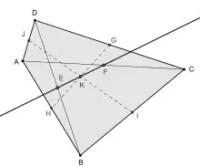 Les points I, J et K sont alignés sur la droite de Newton de ce quadrilatère complet[1].