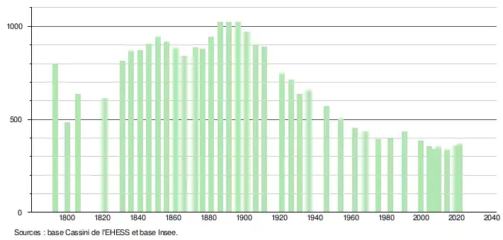 L'évolution du nombre d'habitants est connue à travers les recensements de la population effectués dans la commune depuis 1793. Pour les communes de moins de 10 000 habitants, une enquête de recensement portant sur toute la population est réalisée tous les cinq ans, les populations légales des années intermédiaires étant quant à elles estimées par interpolation ou extrapolation[18]. Pour la commune, le premier recensement exhaustif entrant dans le cadre du nouveau dispositif a été réalisé en 2004[19].