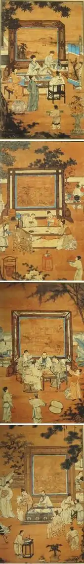 Wang Xianzhi et deux femmes au milieu des saules et des rochers.