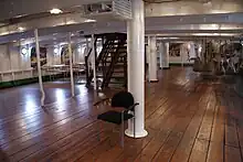 En effet, la double frise de proue n'a été que partiellement restaurée. Il en manque encore une partie et, surtout, la frise arrière est toujours absente[note 15]. Le bateau n'étant plus navigable, la voilure semble également de peu d'intérêt pour ses gestionnaires. Ainsi, le projet initié par l’association consistant à se servir des anciennes voiles du Mercator, pourtant récupérées, pour habiller quelques vergues du navire les jours de fêtes n'a toujours pas abouti[60]. Cela s'ajoute au fait que l'intérieur du bateau était peu garni jusqu'en 2010 malgré l'ébauche de quelques mises en scène (hamacs et posters géants, vareuse du commandant dans son bureau). Aujourd'hui, le portrait de la duchesse d'Oldenbourg trône à nouveau dans les appartements du commandant et une nouvelle présentation historique occupe l'entrepont[note 16]. Il y a désormais quelques objets usuels en situation (par exemple les minuscules coins pharmacie-infirmerie[61], la cuisine et la salle à manger du commandant[note 17]), mais il manque encore de véritables reconstitutions avec mannequins costumés et une scénarisation audio-visuelle. Cependant, cela nécessite des moyens et des mesures de sécurité et de surveillance adéquats.