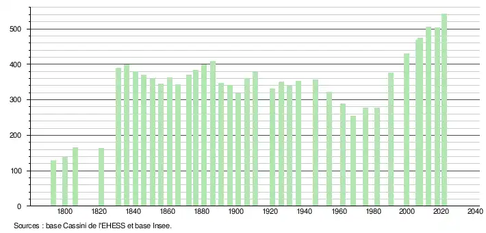 L'évolution du nombre d'habitants est connue à travers les recensements de la population effectués dans la commune depuis 1793. Pour les communes de moins de 10 000 habitants, une enquête de recensement portant sur toute la population est réalisée tous les cinq ans, les populations légales des années intermédiaires étant quant à elles estimées par interpolation ou extrapolation[28]. Pour la commune, le premier recensement exhaustif entrant dans le cadre du nouveau dispositif a été réalisé en 2007[29].