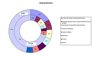 En ce qui concerne les emplois masculins, on peut noter la sur-représentation des dessinateurs, ingénieurs et techniciens cartographes, par rapport au reste de la Géorgie, mais aussi l'importance des agriculteurs et des religieux.