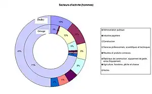 Pour la population active masculine, les principaux secteurs d'activité sont l'administration publique (11 %) et l'industrie papetière (11 %).