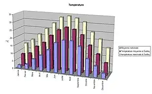 | Température maximale moyenne (°C) | 14 | 17 | 21 | 25 | 29 | 33 | 34 | 33 | 31 | 25 | 21 | 16 | 24,9 |