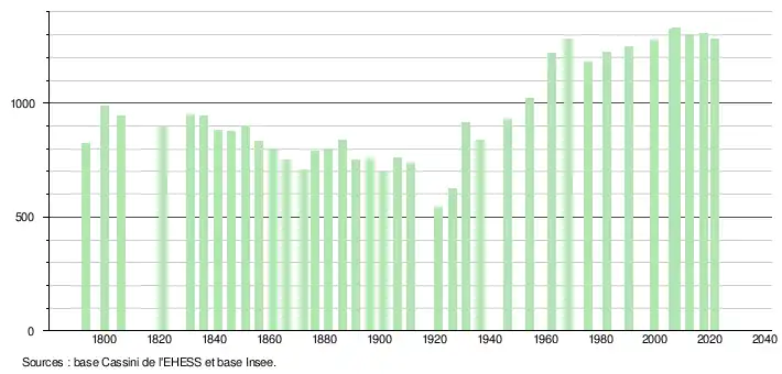 L'évolution du nombre d'habitants est connue à travers les recensements de la population effectués dans la commune depuis 1793. Pour les communes de moins de 10 000 habitants, une enquête de recensement portant sur toute la population est réalisée tous les cinq ans, les populations légales des années intermédiaires étant quant à elles estimées par interpolation ou extrapolation[17]. Pour la commune, le premier recensement exhaustif entrant dans le cadre du nouveau dispositif a été réalisé en 2007[18].