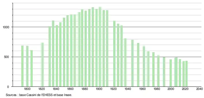 L'évolution du nombre d'habitants est connue à travers les recensements de la population effectués dans la commune depuis 1793. Pour les communes de moins de 10 000 habitants, une enquête de recensement portant sur toute la population est réalisée tous les cinq ans, les populations légales des années intermédiaires étant quant à elles estimées par interpolation ou extrapolation[34]. Pour la commune, le premier recensement exhaustif entrant dans le cadre du nouveau dispositif a été réalisé en 2007[35].