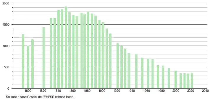 L'évolution du nombre d'habitants est connue à travers les recensements de la population effectués dans la commune depuis 1793. Pour les communes de moins de 10 000 habitants, une enquête de recensement portant sur toute la population est réalisée tous les cinq ans, les populations légales des années intermédiaires étant quant à elles estimées par interpolation ou extrapolation[19]. Pour la commune, le premier recensement exhaustif entrant dans le cadre du nouveau dispositif a été réalisé en 2006[20].