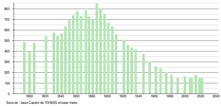 L'évolution du nombre d'habitants est connue à travers les recensements de la population effectués dans la commune depuis 1793. Pour les communes de moins de 10 000 habitants, une enquête de recensement portant sur toute la population est réalisée tous les cinq ans, les populations légales des années intermédiaires étant quant à elles estimées par interpolation ou extrapolation[17]. Pour la commune, le premier recensement exhaustif entrant dans le cadre du nouveau dispositif a été réalisé en 2008[18].