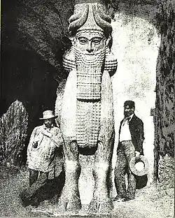 Taureau androcéphale ailé de Dur-Sharrukin, trouvé durant les fouilles de Paul-Émile Botta et transporté au musée du Louvre. | ||