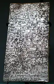 Tablettes de fondation en argent et or. Ces tablettes, avec deux autres, faisaient partie d’un lot de plaques de fondation découvertes dans un coffret de pierre, enfoui dans les fondations du palais construit par Sargon II. Musée du Louvre[20]. | ||